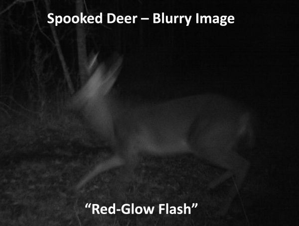Subsequently, through the taking of several thousand nighttime trail cam photos over multiple years in the field using “red-glow” cameras, the long “red-glow” effect caused deer to almost always notice and focus in on the camera, and at times to bolt and shy away.