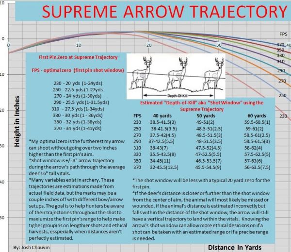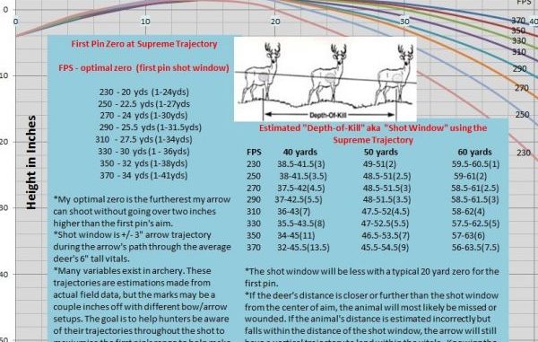 Also, the arrow will be within 3 inches of this zeroed distance for a few more yards extending beyond the first pin’s range. This gives an effective “shot window” (which is described in chart) totaling 31.5 yards with my wife’s bow and 38 yards with my Full Throttle. Hold that first pin on the center of the vitals within those distances, and you’ve got a dead deer.