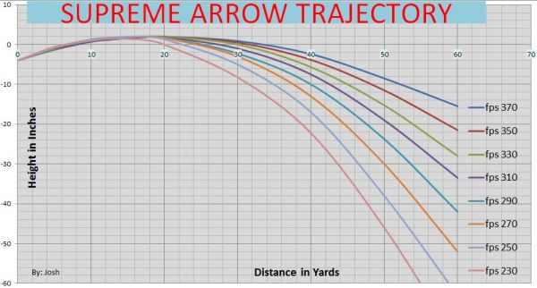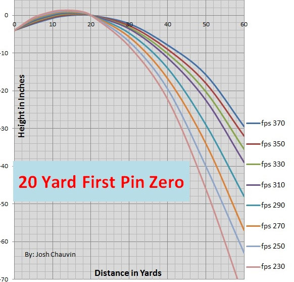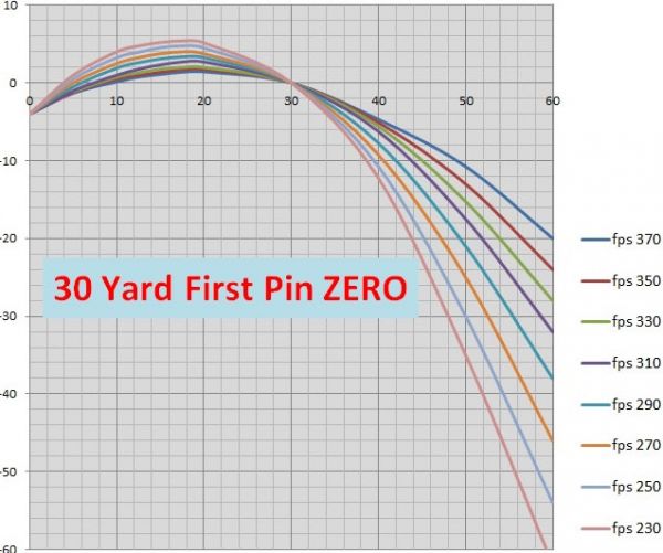 Through extensive Internet research of rare arrow trajectory charts and my own hours of testing with a chronograph and different bows, I was able to create some trajectory charts which allow me to set the first pin at the furthest distance possible for the flattest shooting.