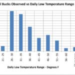 Daily high temperature by itself was not found to be as useful as a predictor of buck movement as daily low temperature. See the accompanying chart.