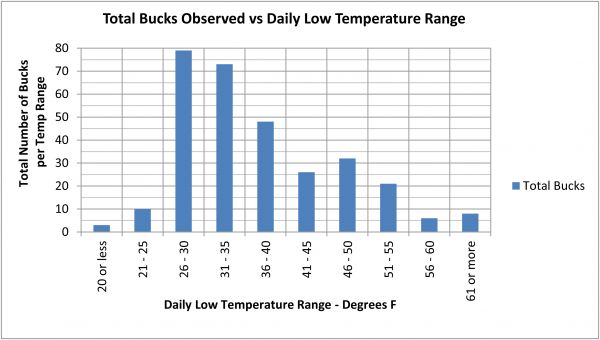 I compared daily buck movement with the corresponding daily low temperature, as recorded by the National Weather Service, and found that there was actually a prominent sweet spot for overall buck movement: Fully 50 percent of all observed buck movement occurred on days when the morning low ranged from 31 to 40 degrees, with 70 percent of all buck movement corresponding to days with a low temperature below 46 degrees.