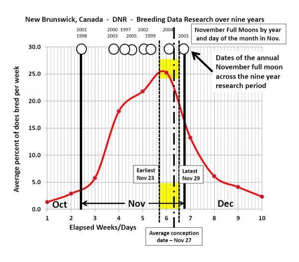 While the full-moon date during November historically bounced all over the place from year to year, the rut-induced average breeding date stayed relatively constant within the same four- to seven-day window.