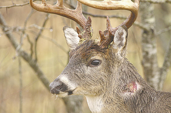 Despite a buck’s display of toughness, eventually another buck of equal age, size, strength, antler mass and instinctive determination will arrive on the scene. Immediately a conflict can ensue between the two, leading to a frenzy of antler clashing. The action is fast and highly intense. Then the blinding fury of piercing tines punctures necks, chests and sensitive eyes, often causing injuries. Bucks may also bite one another, inflicting wounds to the eyes, ears and neck.