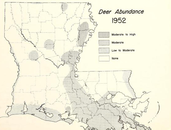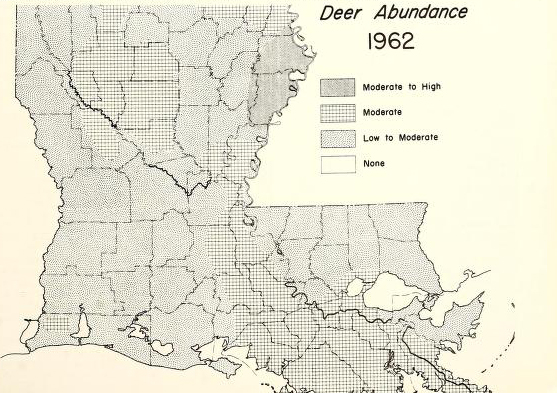 By the late 1940s, most of the deer were concentrated in 16 parishes, but even in those regions the herd density was just one per 74 acres. There were so few deer, in fact, that only 15 percent of the state was open for hunting in the 1948-49 season, and less than 1,000 deer were harvested.