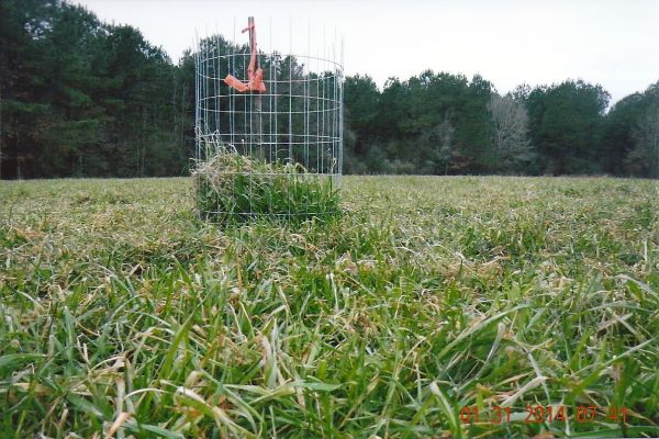 The photograph of the excluder cage in this green field clearly shows the browsing pressure that has been exerted by deer on the green forage this winter. In some cases the food plots have been so over-browsed that they look like someone just painted the dirt green; there is no plant growth.