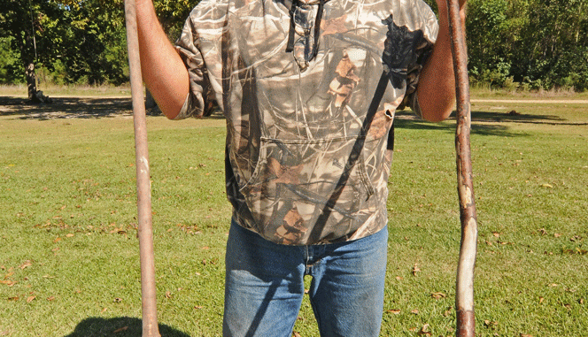 That’s because the thick layer of salvinia and grass serve as obstacles for paddles, whereas the forks of the sticks simply push the vegetation down.