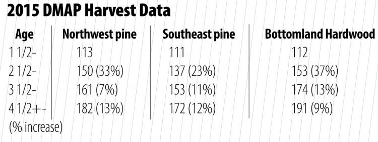 The data shows that the best growth occurs from age one to age two. The percentage increase is great for the northwest pine and bottomland hardwood habitat but is somewhat low for the southeast pine woods. This is probably a true reflection of what is going on in southeast Louisiana. Dramatic changes in the landscape in this part of the state has taken its toll on the deer habitat. Intense pine management has removed the quality browse that bucks need for good growth and development.