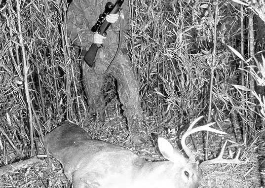 The doe, by this time, was only about 50 yards from the stand, and I gently squeezed the trigger as it stepped past a tree.