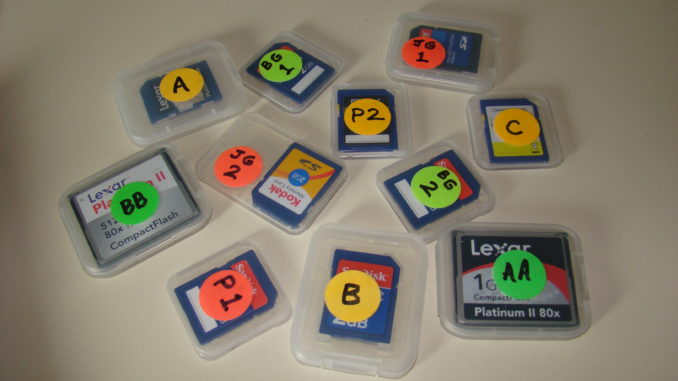 When my cameras are out, one of the two dedicated memory cards for each camera is always installed and in operation storing photographs, while the remaining alternate memory card for each camera stands ready for rotation into action during the next camera site visit.