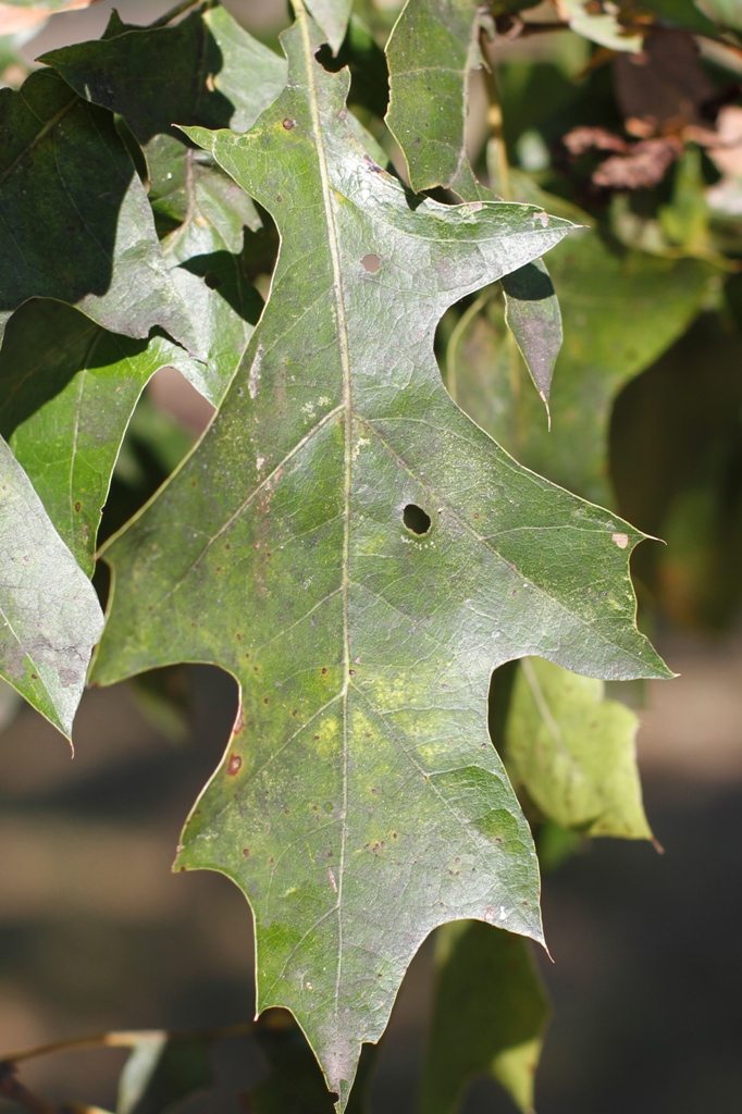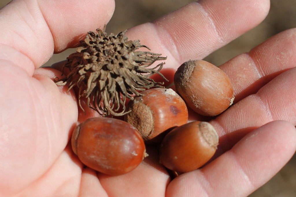 The cherrybark oak is so named because of the similarity of its bark to that of the cherry tree. It is not adapted to the wetter sites as is the nuttall; rather the cherrybark can typically be found on loamy sites of river bottom ridges, well-drained bottoms and loess hills along the Mississippi River. It is intolerant of flooding and shade. The brown, lightly striped acorns, which are more round than nuttall and only about .6 inches long, mature from September through November. The acorns are eaten by waterfowl, turkeys, raccoons, deer, squirrels and many forest-dwelling songbirds.