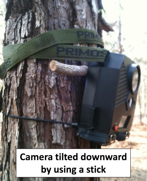 To elevate a camera properly, leave some slack in the mounting strap and wedge a stick or dowel just above the strap between the tree and the rear of the camera. This gets the camera itself up out of a deer’s normal plane of vision, but more importantly the camera itself is usually not noticed — and at night the flash is not nearly as likely to spook deer.