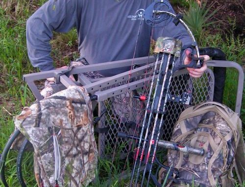 A climbing stand, a bow and arrow, and a bag of buck treasures is all Brad Smith needs in his quest of one more trophy deer.