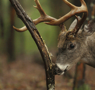 Once a dominant buck tends a receptive doe, the potential for rubbing unfolds. Although the majority of tree rubbing diminishes considerably as the rut heightens and females come into estrus, it can still occur while the buck guards his mate.