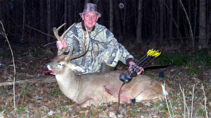 This time he circled in a direction that put him close to being downwind. I had about given up on him when he stopped in a natural lane. Really, it looked like a narrow pipeline with the buck on one end and me on the other. I managed to bend down, get another arrow, and nock it while trying to keep an eye on him. Just when I got my arrow nocked, he turned his head looking away. It was almost dream like. Purely instinctive, I took the shot, and watched the arrow arch and drop, just behind his shoulder in the center of his rib cage. A perfect double lung pass through.