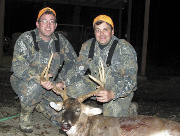 Another deer was tagging along some distance behind the big deer, but both hunters were transfixed by the lead buck. As it worked its way along the edge of the opening, the deer was walking almost directly toward the double ladder stand in which Hollier and Charles were sitting.