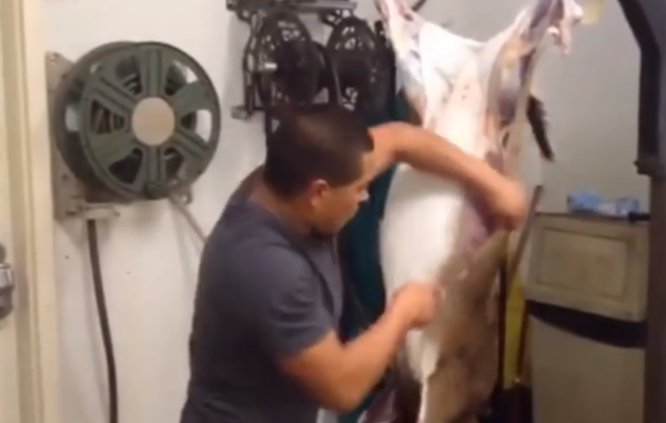The whole process — including cutting off all four legs, throwing the guts in a nearby container, and trimming the flanks and fat from the underside and rear legs, and cutting its head off — is a blur of motion.