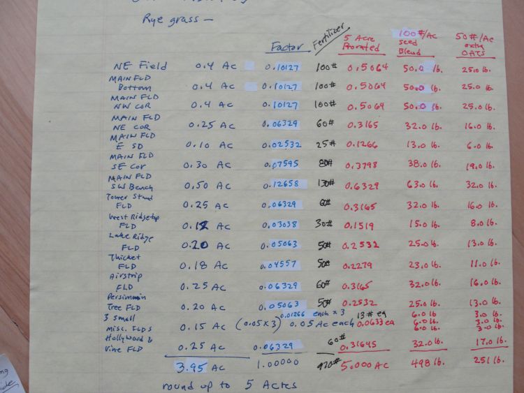 The first thing you need to have is a fairly accurate measurement of each food plot in acres or fractions of an acre, and the overall total acreage that will be prepared, planted and fertilized.