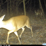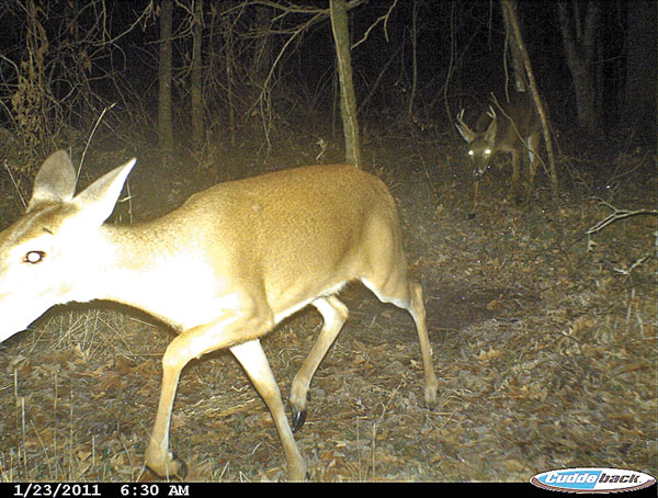 The trail camera photo on Jan. 10 shows a buck getting a serious whiff of the scent that has been left on the ground in the scrape. The photo on Jan. 23 shows a doe passing through the scrape with a buck hot on her trail. If you believe that the breeding is done only by the big boys check out the rack on the buck.