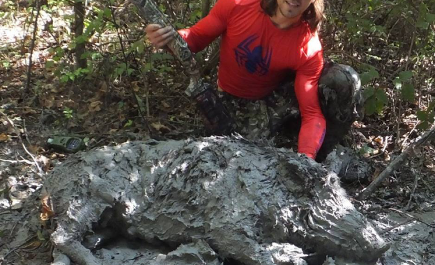 The next weekend started with me taking a big 200-pound boar using Dead Coyote shells on a close shot. The hog still ran 200 yards and died in a muddy wallow where he was completely covered in slop. My wife videoed me getting full of mud myself, taking 10 minutes to roll him out to clean.