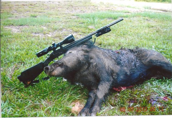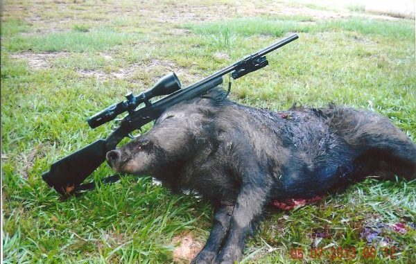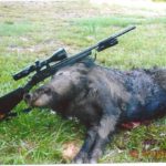 I thought I heard the sound of a pig running off, but I could see movement in the clover and grass where the hog had been standing. Easing over, I saw a nice, large hog on the ground that was making a few final movements with its hind legs. My shot was a little back from the head; usually I aim for the base of the skull. The bullet had hit the spine just above the front shoulders, dropping the hog immediately and causing severe hemorrhaging.