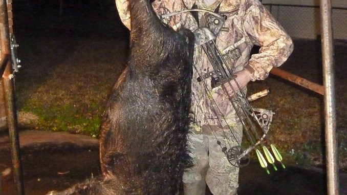 After only two more ribbons and 30 yards from the shot, there lay my hog. It is a big, black sow. I radio Dad with the good news and head back to the boat to get my cart.