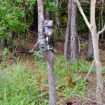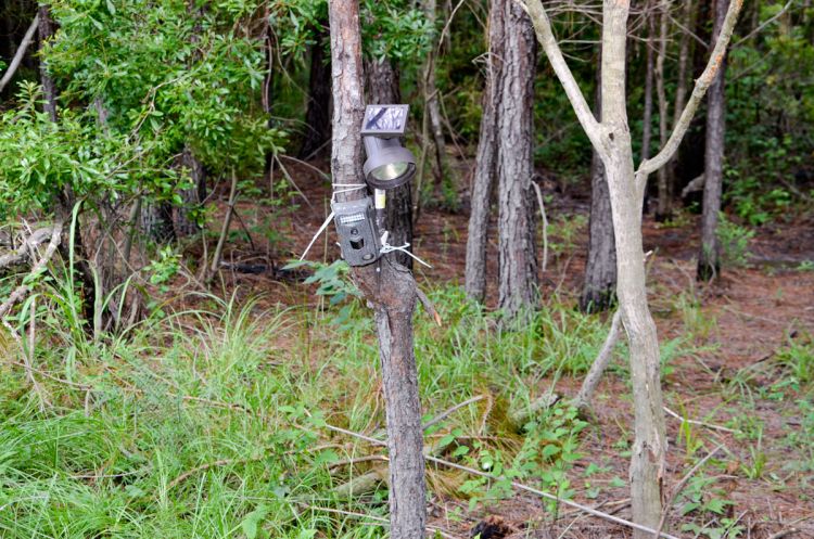 Shiree stresses that it is important to set up a light post and camera at the same time that feed is first placed on the site, so that there are no later changes to the site that will disturb the hogs once they start using the bait pile.