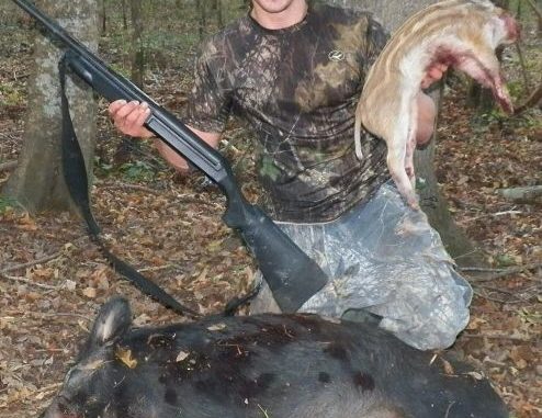 Meanwhile one of the smaller hogs that I passed up on the chase came sprinting through like a rabbit. I decided to take the sure kill, took the gun off safety and knocked down the small hog at 10 yards on the run. I put a second shot to finish the pig off quickly, making certain of a kill.
