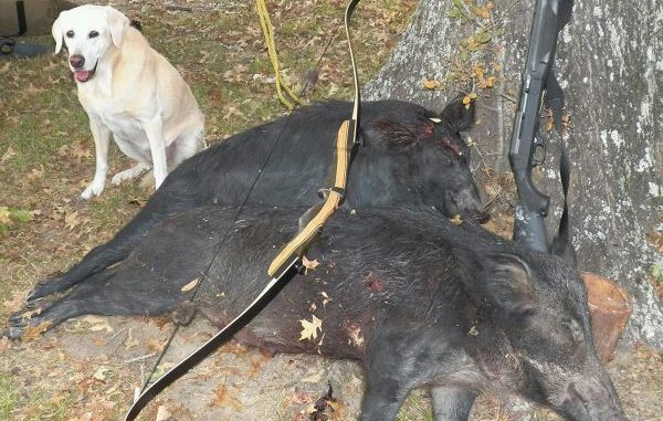 This is the second big hog I knocked down on the run with one shot using these 3 ½-inch high-powered shells that toss out 51 pellets of tungsten.
