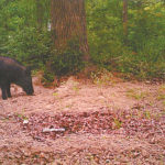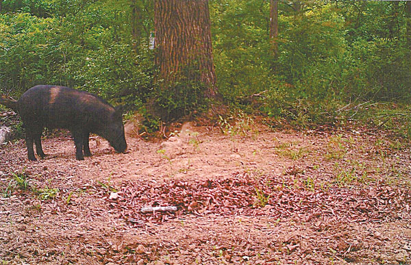 When the turkey season ended in April, I started baiting for hogs, and it wasn’t long before the pigs were addicted to the rice bran and corn. Using a Bushnell Trophy Cam to monitor the site, I learned that several boars and a group of sows with piglets were coming to the bait.