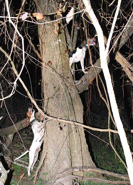 First Memphis cut a scent trail and keened. Then both dogs opened up, and within 10 minutes, their melodic bawls turned into the raucous bark that signaled a successful treeing. This time, the raccoon had ascended a much smaller tree before crossing over into a larger one. But both dogs were pinned to the small tree. Their actions were so frenzied that it seemed they might suffer a coronary.