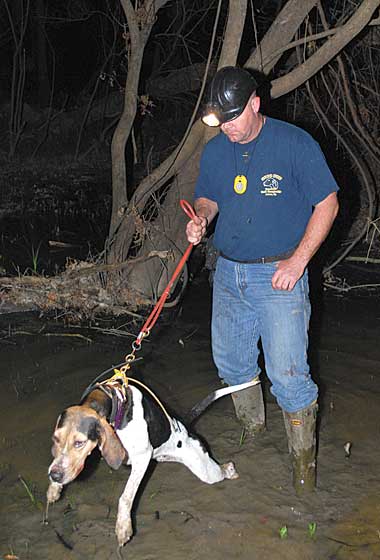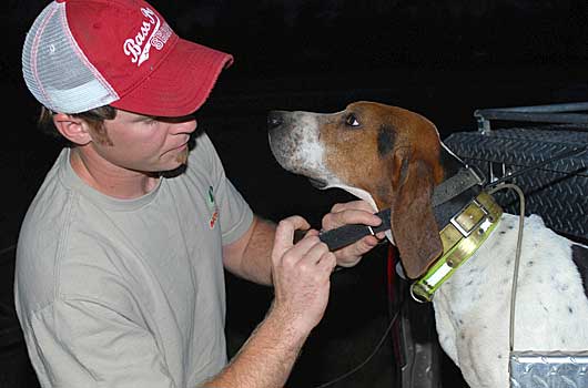 Tonight we would be hunting with two Walker hounds, Rock and Memphis, both of which are actively trained for and used in competitive coon hunting in Professional Kennel Club (PKC) competitions. The dogs and several others were owned by Carnegie prior to his purchase of PKC. Harvey and Gottschalck handled the dogs in competition for Carnegie, and now Harvey has ownership of the animals.
