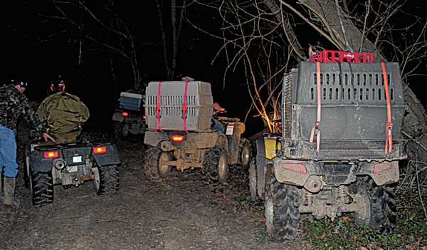 The caravan of five ATVs carrying the seven men snaked sinuously through the dark woods, avoiding the many downed trees and deadfalls produced by Hurricane Gustav. Skilful maneuvering brought the men’s ATVs to within 50 feet of the treed dogs.