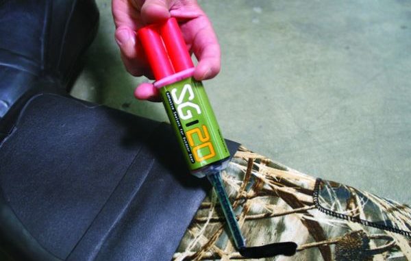 SG-20 is a blend of two polyurethane adhesive materials that sticks to neoprene, canvas and a variety of other materials. Damaged gear can be fixed by drying it out and applying SG-20, which comes in a syringe-like applicator that mixes the adhesives. According to the company, the repair takes about an hour. We won’t dare dispute that schedule, because the repaired boots were ready to go if we’d had an afternoon hunt planned.