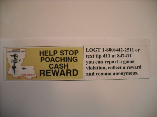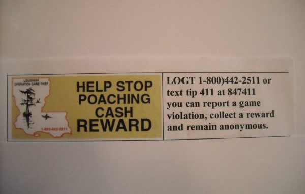 Donations are tax deductible, and can be sent to Louisiana Operation Game Thief, Inc., c/o Louisiana Department of Wildlife & Fisheries, P. O. Box 98000, Baton Rouge, LA 70898.