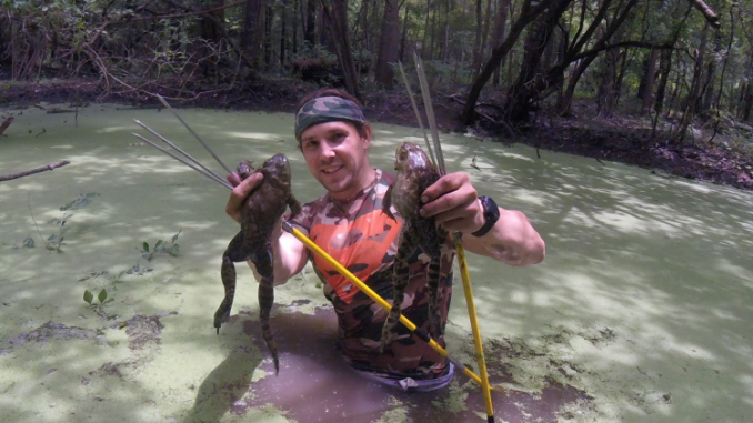 Hunting massive bullfrogs during the daytime is one of my favorite summertime activities. After shooting many frogs with my bowfishing rig, I wanted to take the experience to the next level: So this year I went after them caveman-style with my throwing spear.