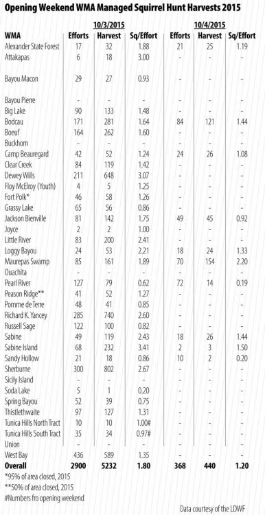 Cedatol also touted Dewey Wills WMA in Central Louisiana. The popular area delivered 648 squirrels in 211 hunter efforts for 3.07 squirrels per effort.