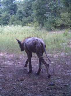 The trail cam photo taken earlier this month east of Toledo Bend shows what almost looks like a small hyena, with big ears, very little hair, striped hocks and a furry neck.