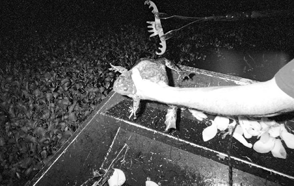 As quickly as I could, I would shove frogs into a 4-inch PVC pipe that led down into the frog net sack fastened to it in the bottom of the boat.