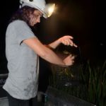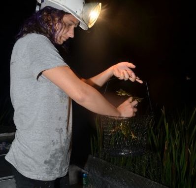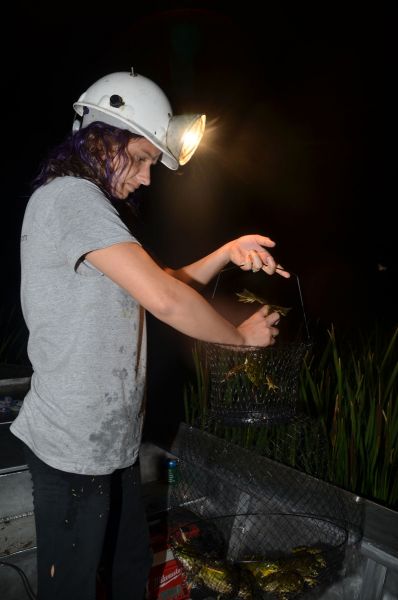 Frogging is a specialized sport. Even though frogs’ eyes shine in the dark, they can be hard to spot, especially if the frog is partially shielded by water lilies or sitting on the bank behind a bunch of brush.