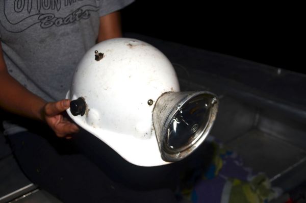 Corey Crochet uses a light similar to what many other Atchafalaya Basin froggers use. They are built with a plastic hard hat, a sealed beam bulb, an aluminum funnel, a toggle switch, electrical wires, a pair of alligator clamps and some small screws or nuts and bolts.