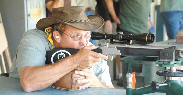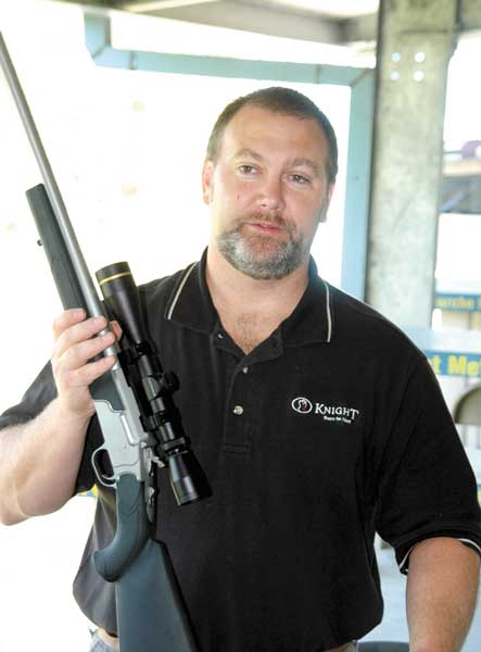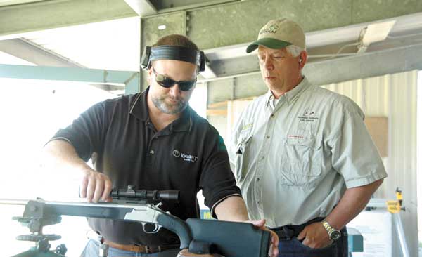 While the group of writers gave an amazingly inept demonstration of shotgun skills at sporting clays, Mike Mattly, marketing manager of Knight Rifles, set up a demonstration of the KP-1 muzzleloaders and the new KP-1 “Wurfflein” style of single-shot rifles.