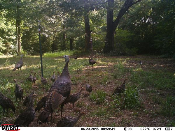 I began getting pictures of young turkeys on May 5, and have been seeing them ever since. This year, to date, there were three hens with about 16 poults — an average of five poults per hen, which is great.