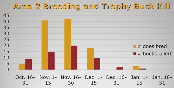 When the gun season opens in Area 2 in late October, breeding is beginning, and the trophy buck kill tracks the breeding activity during the gun season. The big buck harvest is good in November and continues into December; by December, many Area 2 hunters have killed several deer, and are thinking about other activities and their deer hunting effort is on the decline.