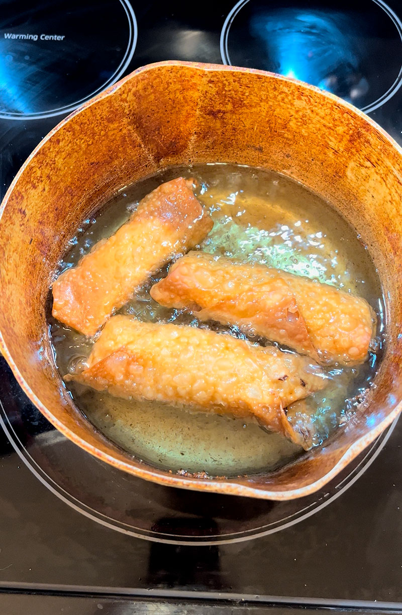 5. Place egg rolls into the heated oil and fry, flipping occasionally, until the egg rolls are a golden brown. Remove from the oil and place on a wire rack to drain.