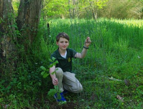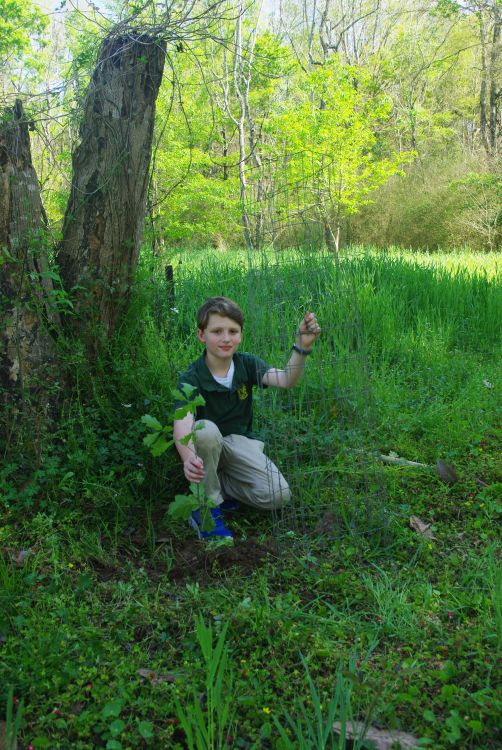 Generally it is best and more economical to plant seedlings rather than container trees. Container trees planted in April may need to be watered if Mother Nature does not provide the water. Another thing to keep in mind is that deer love to eat freshly planted trees so some type of caging may be in order to prevent heavy browsing. Tree planting is a habitat project designed to improve habitat conditions over time. Once the tree begins producing fruit, you now have a source for seed and new trees over time so it is a project that will give back in several ways, food for wildlife and seed for the next forest.
