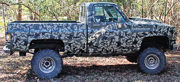 Truck Stencils is a do-it-yourself, patent pending invention that uses a set of lightweight, reusable magnetic painting stencils to allow hunters to paint a camouflage design on their truck or hunting vehicle.