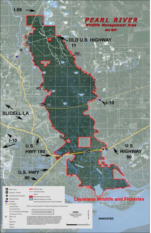 The Pearl River Wildlife Management Area is located between the Pearl River at the Louisiana-Mississippi state boundary, and the West Pearl river from the east end of the Rigolets by the Mississippi Sound to a point where I-59 crosses its boundary.