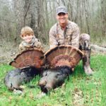 As the two gobblers came to a screeching halt, they raised their heads to survey the situation. Kinsman fired at his gobbler first, quickly followed by Trey.