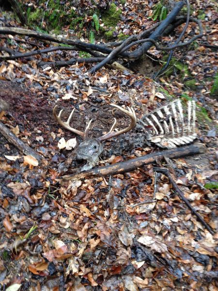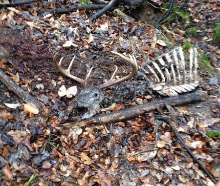 Turning off the trail and peering over the edge, I was shocked to see a dead buck with a respectable rack lying at the edge of the water hole — covered with buzzards. They all flew at the sight of me.