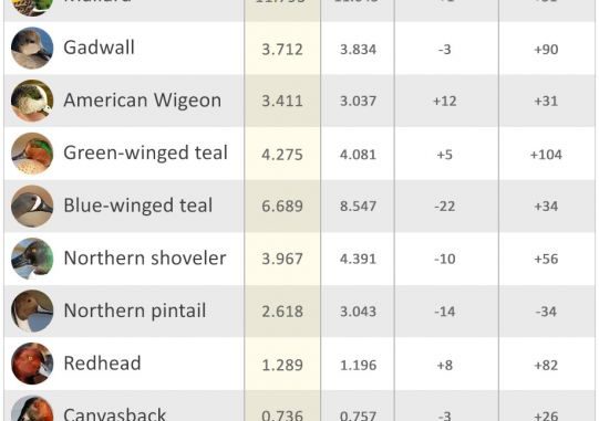 “What’s not reflected in the report is that there was fairly significant improvement in habitat conditions after the surveys were completed. In some key production areas, heavy June and July rains greatly improved wetland conditions. This could benefit brood rearing and the success of late nesting species, as well as give a boost to overall production through re-nesting by early nesting species.”